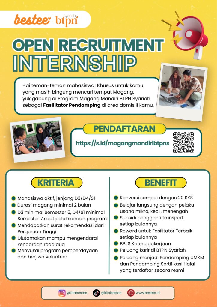 STIE YAPIS Dompu melalui kerja sama resmi (MoU) dengan BTPN Syariah kembali membuka kesempatan bagi mahasiswa untuk mengikuti Program Magang Mandiri BTPN Syariah. Program ini merupakan peluang istimewa bagi mahasiswa yang ingin terjun langsung dalam aktivitas pemberdayaan masyarakat, khususnya di bidang UMKM.